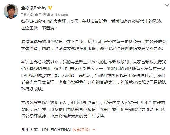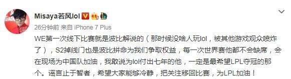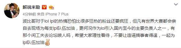 WE第一次线下比赛就是波比解说的(那时候没啥人玩lol,被其他游戏观众喷炸了),S2掉线门也是波比拼命为我们争取权益,每一次世界赛他都不会缺席,会在现场为中国队加油,我敢说为lol付出七年的他,一定是最希望LPL夺冠的那个。谣言止于智者,希望大家能够冷静,把关注移回比赛,为LPL加油!