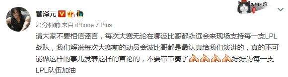 请大家不要相信谣言,每次大赛无论在哪波比哥都永远会来现场支持每一支LPL战队,我们解说每次大赛前的动员会波比哥都是最认真给我们演讲的,真的不可能做这样的事儿发表这样的言论的,不要带节奏了,好好为每一支LPL队伍加油