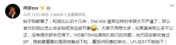 帖子我都看了,和波比认识十几年,59e 60e 皇军这样的字眼太不严谨了,那么官方的波比怎么会去贴吧发这些节奏。大家不用想太多,如果真有那么多不公正,没有俱乐部会忍得下。WE输TSM也是我们自己的问题,当天回去都反省过BP,眼前最重要的是团结备战下轮,重现洲际赛的荣光,LPL在S7不能倒下!