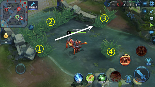 如果打野选择红开,那么辅助开局就来占领①草丛的视野(蓝开的话就占对面河道的视野)