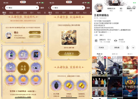 在1月10日晚7点热血开启的回归直播中,骚白又会和粉丝透露哪些有趣好玩的内容?打开快手App搜索“骚白”即可一键预约直播,与骚白在游戏中一较高下赢取万元挑战金,在游戏竞技中一起感受青春热血,共同见证荣耀时刻